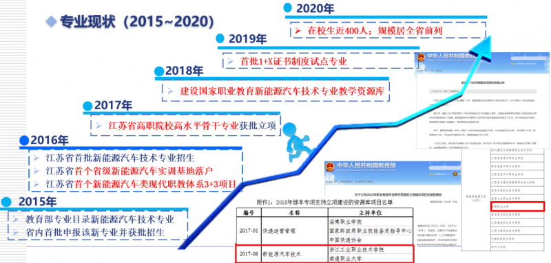 新能源汽车专业建立于2015年,是江苏省内首批申报并获批招生的。2016年江苏省首个省级新能源汽车实训基地落户,苏省首个新能源汽车类现代职教体系3+3项目获批。2017年江苏省高职院校高水平骨干专业获批立项。2018年联合主持建设国家职业教育新能源汽车技术专业教学资源库。2019年成为首批1+X证书制度试点专业,同年获批国家级骨干专业。通过专业团队这几年来的努力,专业主要具备以下特点: