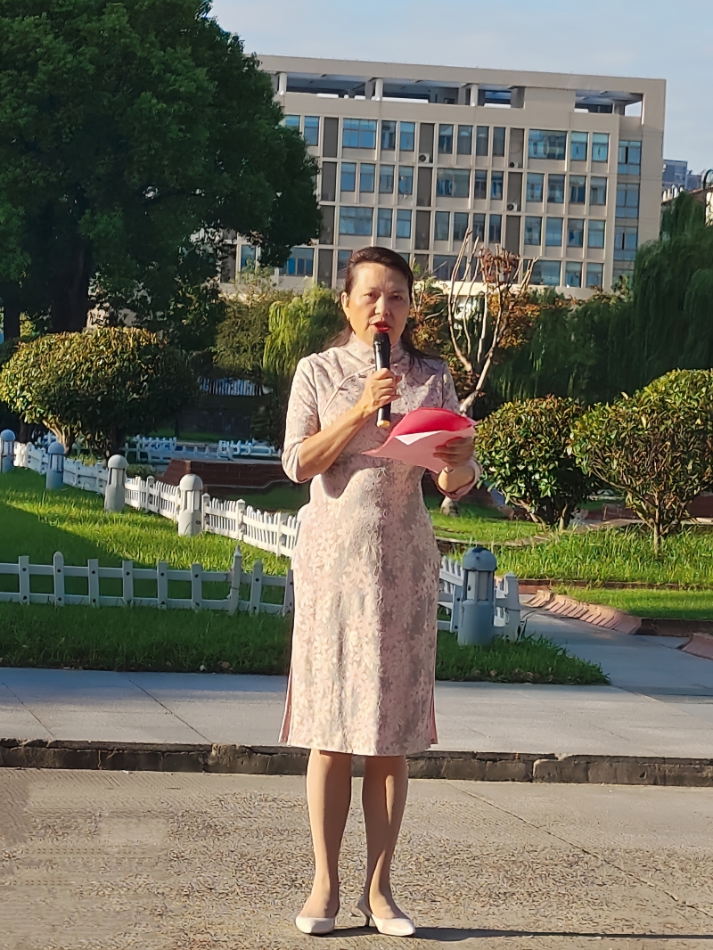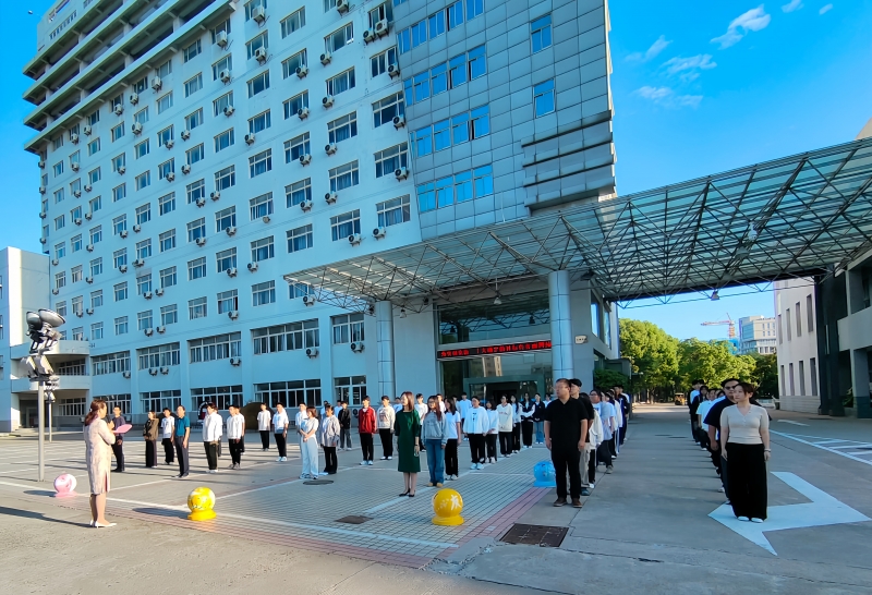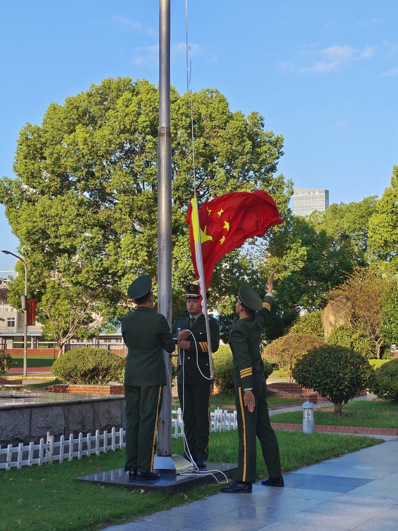 晨光熹微,鸟鸣声声。“请全体肃立,迎国旗!”一声令下,整装待发的国旗仪仗队成员们手擎五星红旗,迈着坚定的步伐向升旗台走去,他们昂首挺胸、正视前方、阔步向前。“立定!”旗手牵动旗绳,护旗人抛开旗面,伴随着雄壮激昂的《义勇军进行曲》,鲜艳的国旗徐徐升起,在空中高高飘扬。现场成员的目光紧随国旗,氛围庄严肃穆。