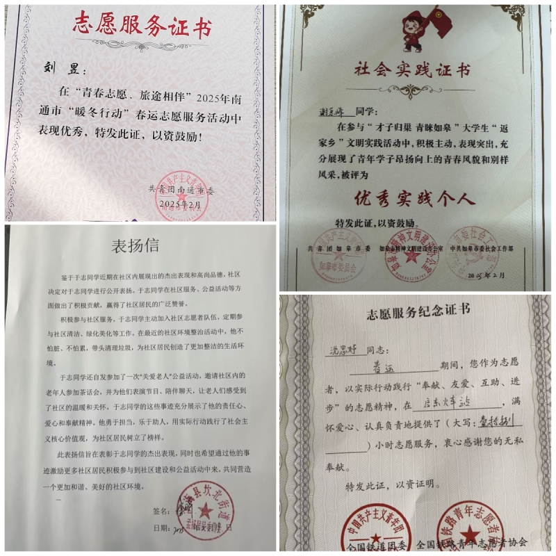 此次社会实践活动不仅让学生们得到了锻炼与成长,还让他们收获了荣誉与认可。新汽244ZA班谢京峰同学被如皋团市委评为“优秀实践个人”,汽车240班于志收到了来自当地社区的表扬信,表扬他在社会实践中的出色表现。这些荣誉与认可不仅是对他们辛勤付出的肯定,更是对他们青春担当的褒奖。