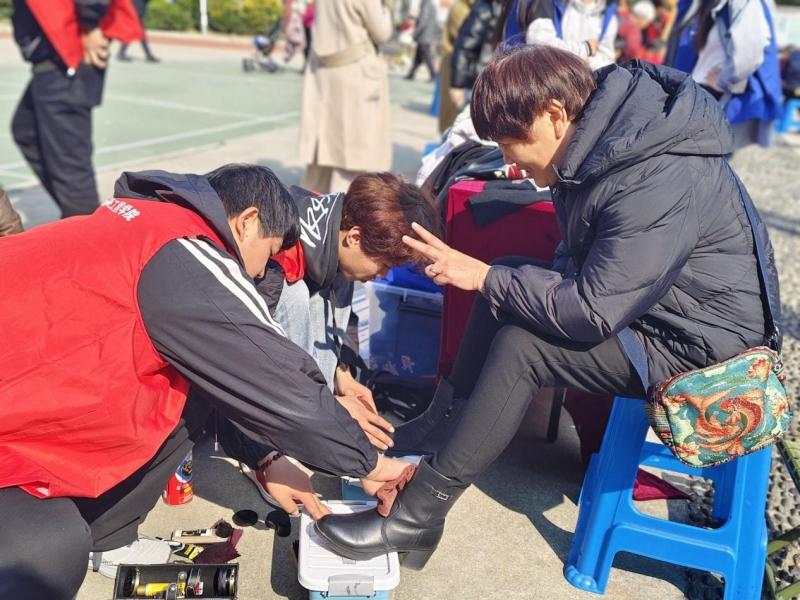 在众多志愿服务项目中,交通学院的“同心‘鞋’力”志愿服务尤为引人注目。志愿者们身着统一的服装,携带专业的擦鞋工具和材料,面带微笑,耐心且细致地为社区居民提供免费擦鞋服务。他们热情洋溢地为每一位前来体验的居民提供服务,不仅让一双双鞋子焕然一新,也更以实际行动传递了温暖与关爱。这一贴心服务赢得了社区居民的广泛赞誉,大家纷纷为志愿者们的热情与奉献精神点赞。