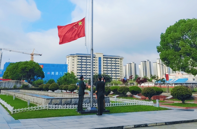 国旗仪仗队的同学们步伐坚定、整齐划一,护送着五星红旗走向旗杆。全体师生肃立,面向国旗表达最崇高的敬意。伴随着《义勇军进行曲》的激昂旋律,五星红旗在校园上空缓缓升起。