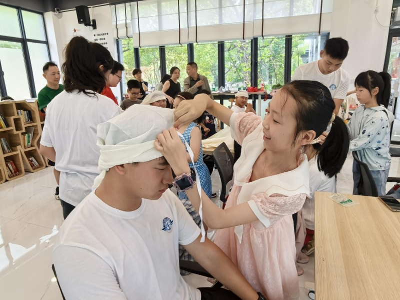 知识赋能,安全宣讲筑牢生命防线。活动在“守护生命线”安全教育宣讲中拉开帷幕。实践团成员结合暑期高发安全场景,通过动画演示、情景模拟等形式,系统讲解了交通安全规则与夏季防溺水要点。讲解不止于“听”,更重在“做”。小朋友们化身为“小小救护员”,在团队成员指导下认真练习了急救包扎的基本技能。缠绕、打结,稚嫩的小手初次触摸到守护生命的力量,安全意识的种子在此刻深深扎根。