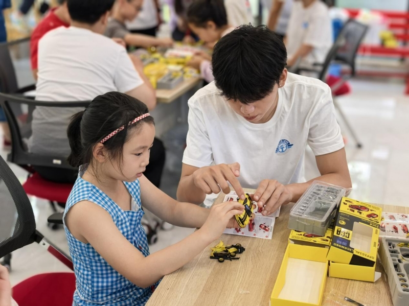 匠心传承,汽车拼装启迪职业梦想。在“汽车梦工厂”DIY环节,孩子们化身小小工程师,专注地拼装着手中的汽车模型。实践团成员结合自身交通专业背景,适时讲解汽车基本构造原理,将交通科技的种子悄然播撒。当一辆辆亲手组装的小车成功“驶”过桌面,孩子们眼中闪烁着成就的光芒,对交通工具的好奇与热情被充分点燃。