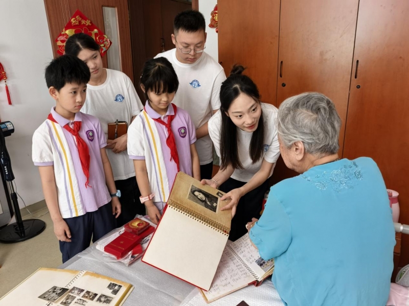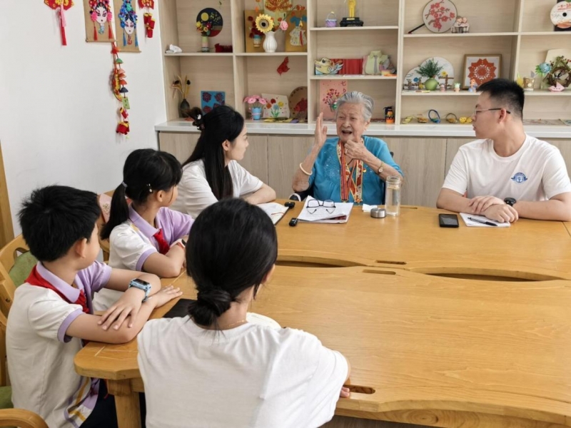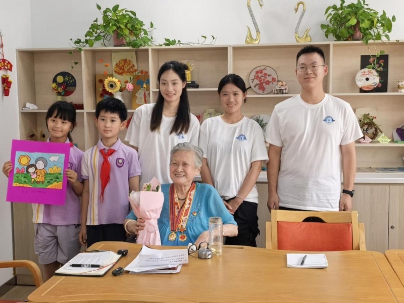 7月25日上午,买球官方网站“青史寻薪传炬火 青春践履润基层”社会实践团携手南通紫琅第一小学少先队员走进阳光老年公寓,共同探望93岁高龄的抗美援朝老战士、南通“知心奶奶”群体创始人颜怡同志。这场跨越三代人的对话,既是一次红色基因的生动传承,更是一堂直击心灵的思政教育课。