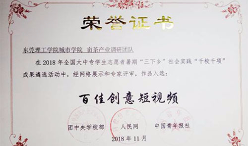 近日,在2018年全国大中专学生志愿者暑期文化科技卫生“三下乡”社会实践“千校千项”成果遴选活动中,经网络展示和专家评审,我院金贸系南亩茶产业调研团队《关于南雄南亩茶产业电商推广的调研》荣获“百佳创意短视频”奖。
