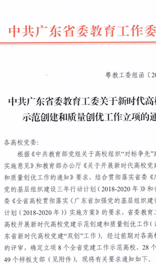 近日,中共广东省委教育工委发布了“关于新时代高校党建示范创建和质量创优工作立项的通知”,确定立项8个全省党建工作示范高校、28个标杆院系、49个样板支部。其中,东莞理工学院城市学院商学院成功立项广东省新时代高校党建示范