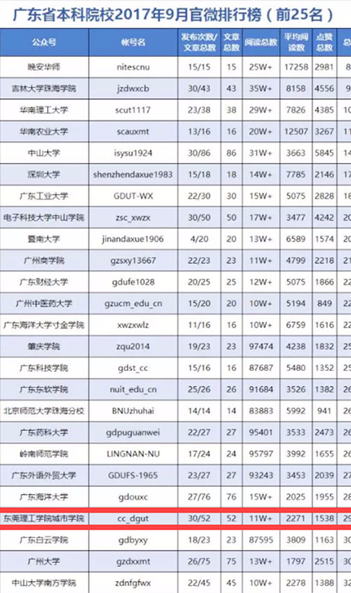 11月5日,广东省教育厅官方微信公众号“广东教育”权威发布“广东高校官方微信公众号9月排行榜”,我院官微位居该排行榜的第22位。 据统计,我院官微在9月份共发送推文52篇,以开学、迎新、军训、招新等内容为主。阅读总