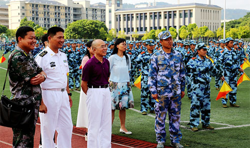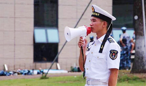 “抬头,挺胸,双脚并拢,十指贴紧裤缝,眼睛直视前方!不许笑!” “左臂抬高,拳头半握,与前胸平行,右臂往后四十五度!” 烈日炎炎,一袭白色海军军装的四连连长汪宗良正严格训练17级的新生,口令准确、步伐矫健。嘹