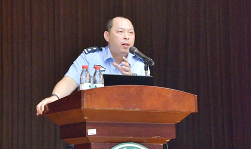 9月13日晚,新生入学教育系列讲座第三讲开讲,东莞市寮步公安分局刑警大队黄东城警官在综合馆为2017级新生作“以案说防”法制安全知识讲座。 黄警官从“电信诈骗、校园贷、毒品危害、校园盗窃”等方面,通过多个发生在同学们身
