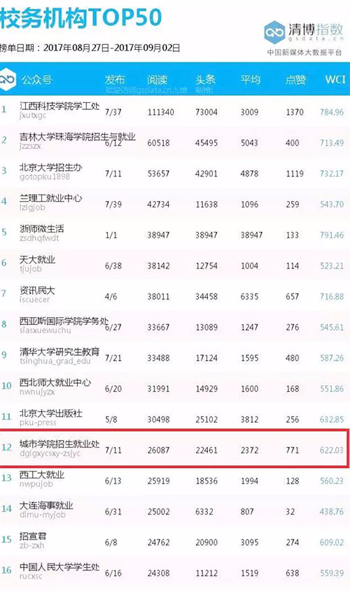 9月5日,《南方周末》数据实验室公布了最新一期(8月20日-8月26日、8月27日-9月2日)《中国高校微信排行榜》校务机构排名。我院招生就业处微信公众号在全国3000多个高校公众号中脱颖而出,连续在两期榜单中跻身全国高校15强,其中WCI指