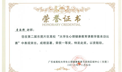 近日,从广东省高校心理健康教育与咨询区域中心(东莞片区)的通知文件获悉,我院心理健康教育与咨询中心詹海都老师在第二届东莞片区高校“大学生心理健康教育课教学基本功比赛”中荣获一等奖。 据悉,本次心理教学基本功比