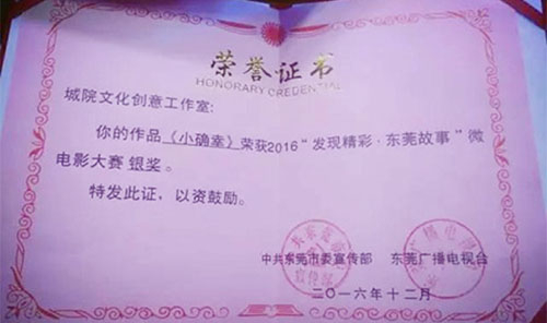 12月15日,由市委宣传部、市城市形象推广办公室主办,东莞广播电视台承办的2016年“发现精彩.东莞故事”微电影大赛的颁奖典礼在东莞电视台举行,我院创意设计学院学生拍摄的微电影《小确幸》喜获银奖。 《小确幸》为东莞首部众