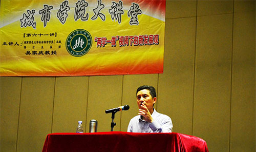 4月21日晚,城院大讲堂第61讲在学术报告厅举行,中央“马克思主义理论研究和建设工程”首席专家、全国“五个一工程”获得者、湖南师范大学马克思主义学院院长吴家庆教授作了《“两学一做”视阈下的新发展观》的主题讲座。 吴