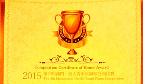 今年暑期在澳门举行的第四届澳门—亚太青少年钢琴公开赛上,我院艺术系2013级音乐表演班陈榕同学获得了决赛肖邦作品高级组的二等奖。同时,陈榕同学还参加了在香港举行的2015“肖邦纪念奖”香港-国际钢琴公开赛,并获得了二等奖。