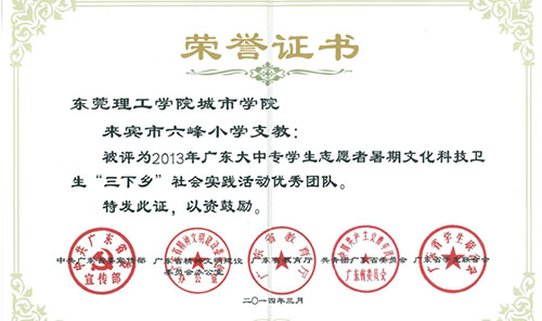 我院文学与传媒系“来宾市六峰小学支教”实践分队被团省委评为“2013年广东大中专学生志愿者暑期文化科技卫生‘三下乡’社会实践活动优秀团队”;指导老师江玲荣获“2013年广东大中专学生志愿者暑期文化科技卫生‘三下乡’社会实践