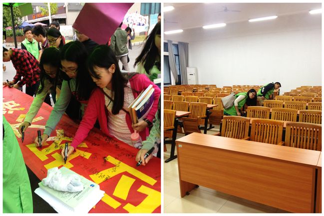 为改善教室卫生环境,营造良好的学习氛围,城环系志愿队与计信系志愿队于11月13日-14日联手开展了主题为“垃圾不落地,教室更美丽”的志愿者卫生宣传主题活动。 活动期间,机信系志愿队组织志愿者到7号教学楼对每间教室进行了