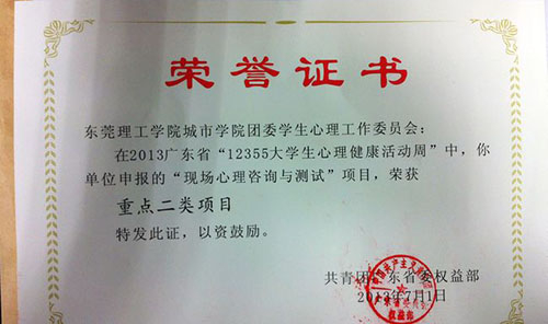 记者近日从团省委权益部获悉,我院心理咨询中心开展的现场心理咨询与测试活动成功申报广东省“12355大学生心理健康活动周”重点项目二类项目。据悉,我院是东莞市唯一一所获此殊荣的高校。 现场心理咨询与测试活动是我院2013年