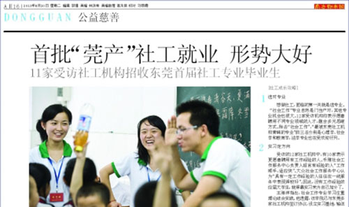 8月20日,南方都市报以《首批“莞产”社工就业,形势大好》为题,对我院第一届“社工班”的就业情况进行报道。 今年被称为“史上最难就业季”,社工领域却是别样风景。报道中指出:东莞对社工专业人才的需求正处于上升阶段,