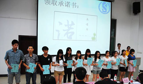 “我宣誓:在考试中,诚实守信,严格遵守考试纪律,做到自警自律,自尊自爱,互相监督,弘扬正气。端正学习态度,考前认真复习功课,以诚实的态度对待每一场考试,考出真实水平,考出诚信学风,共同营造‘诚信考试光荣、违纪作