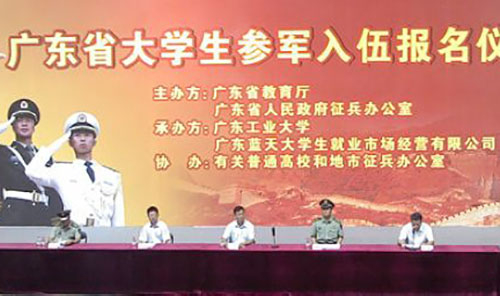 6月21日,广东省征兵办公室、广东省教育厅在广州大学城举行全省大学生参军入伍报名仪式,我院学生处凌继峰老师参加了会议。 会议指出,从今年起,全国征兵时间由冬季调整到夏秋季,与高中、高校毕业季“无缝”对接,为青年学