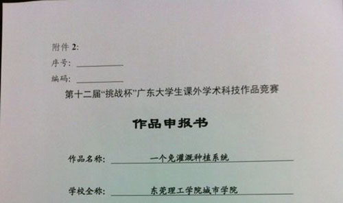 6月3日,从团省委学校部文件中获悉,我院金融与贸易系何志豪、李星凯同学设计制作的“一个免灌溉种植系统”科技作品,获第十二届“挑战杯”广东省大学生课外学术科技作品竞赛“三等奖”。
