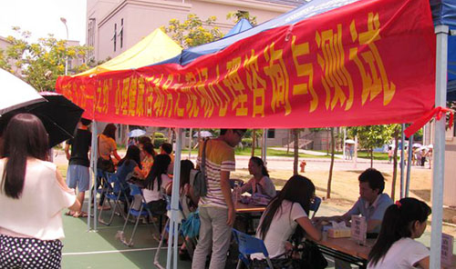 5月30日,我院心理健康教育与咨询中心在羽毛球场开展现场心理咨询与测试。许多同学在大庭广众之下,将自己的心理阴影“晒”阳光。 心理咨询师袁细妹、黎永前、吴帧、余琼、陈浩老师,面对面地为同学们做心理咨询。一位咨询的