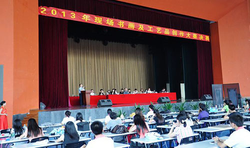 5月23日,来自大二、大一的300多名书画爱好者经过初赛崭露头角,齐聚综合馆,参加由党委宣传部和院团委主办、学生会宣传部承办的现场书画及工艺品制作比赛。 比赛共设硬笔书法、软笔书法、工艺品制作、绘画四个赛区。记者看到