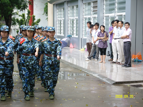 9月19日,管理系主任罗余才教授、系党总支副书记吴春庚,以及王兴、卢淑芳、陈彬、张宏渝等老师及学生会成员,到操场探望军训同学。 在探望过程中,老师们详细了解了2个连军训的情况,鼓励新生们发扬艰苦奋斗的精神,刻苦训练,争