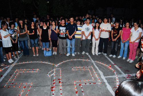 5月15日晚,在杜发游泳馆边的空坪上聚集了数百名学生,举行为四川受灾人民祈祷活动。 许多同学捧着点燃了的红色小蜡烛,围在一个用红色小蜡烛摆成的爱心图案的周围,共同唱着《祈祷》和《明天会更好》的歌曲,沉痛哀悼震灾中的死