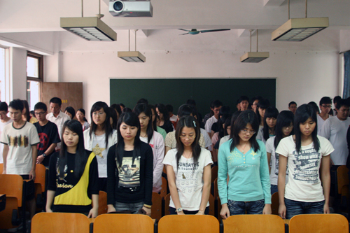 这一刻,异常静默。降了半旗的校园上空,只有警报声在呜咽。 5月19日下午2点28分,天沉沉,雨纷纷。校园里朗朗的读书声暂停了,平日的欢声笑语也停止了。全院师生肃穆地站立,怀着悲痛的心情,以默哀的方式向在汶川地震中不幸遇难