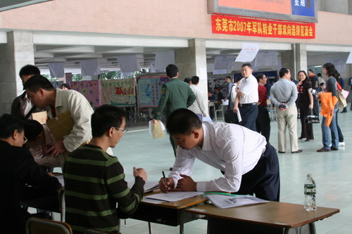 11月12日,东莞市2007年军队转业干部双向选择见面会在我院4号楼大厅举行。 为开好双向选择见面会,学院悬挂了横幅,设置咨询台和路标,张贴了《东莞市2007年接收安置军转干部计划报名单位示意图》。 据悉,这次见面会是由东莞市委
