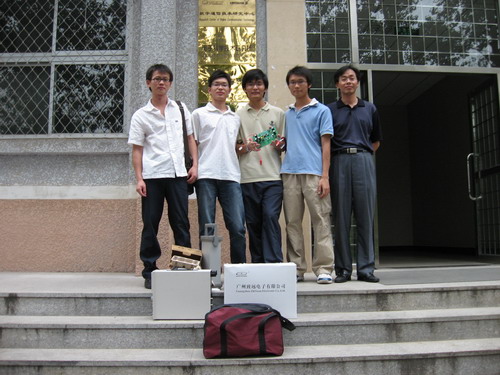 从左至右依次是李建辉老师、肖巍 、王家贤、罗智庆、王彩申老师 11月5日, 2007年全国大学生电子设计竞赛北京决赛现场传来消息,我院派出的GD302代表队荣获一等奖。该代表队由王彩申老师、李建辉老师担任指导教师,参赛选手是