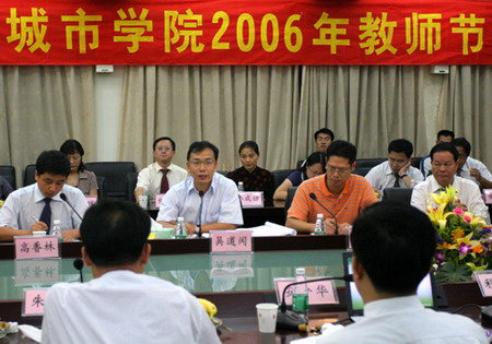 第22个教师节的前夕,按照市委、市政府地统一布置,东莞理工学院城市学院在315会议室召开教师节座谈会。副市长吴道闻代表市委、市政府出席座谈会并与我院教师代表亲切交谈。 安少华院长代表全体教职工对市领导的到来表示热烈欢
