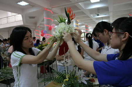 4月20日下午,东莞理工学院城市学院首届插花比赛在学生活动中心举行,有15个小组参加此次比赛。参赛者经过精心构思,用心创意,巧手制作,生产了15件作品。 经评选,以百合花和兰花草相搭配制作的《我心飞翔》荣获本次插花比赛