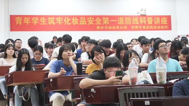 寮步市场监管分局监督员钟佩超向作了化妆品知识科普讲座。李俊杰主任对化妆品出现不良反应常见类型、原因及处置作了专业讲解,从医学角度对化妆品安全知识进行了科普,并现场解答了同学的疑惑。