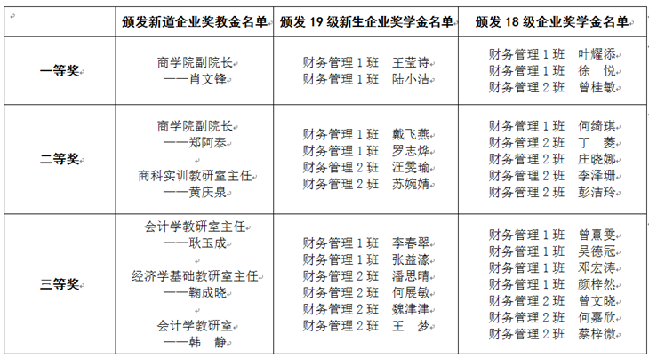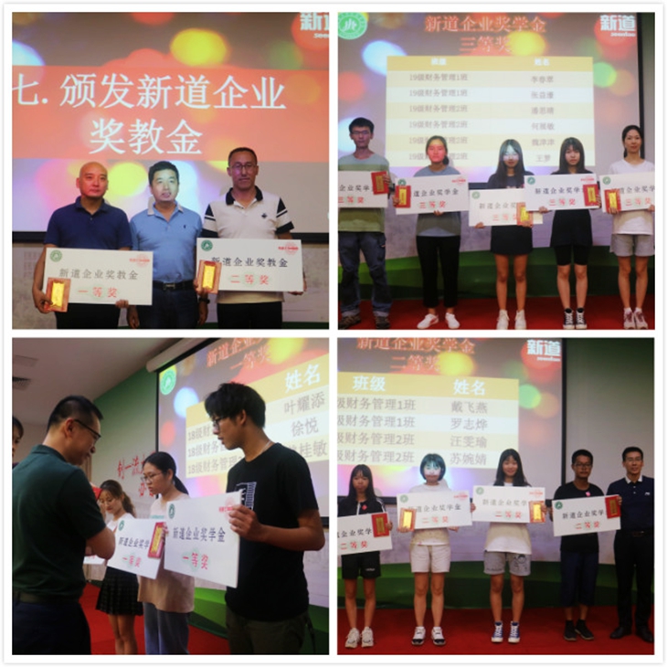 典礼上,校企双方领导为学生代表佩戴专属徽章,并为荣获新道企业奖学金的2018级、2019级学生,以及获得新道企业奖教金的教师颁发了奖金与证书(详见获奖名单)。