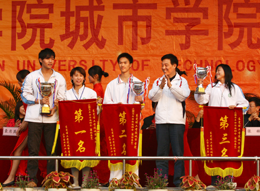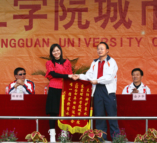 为期两天的城市学院2007年田径运动会12月1日胜利闭幕。下午5时,运动会在田径场举行了隆重的闭幕式。出席闭幕式的领导和嘉宾有:东莞理工学院副院长、城市学院院长安少华教授,城市学院党政领导朱志德、程发良、朱冰、张林,院督学林世俊教授,各系部负责人以及广东太阳神饮用水有限公司东莞分公司经理助理、校友袁月英女士。
