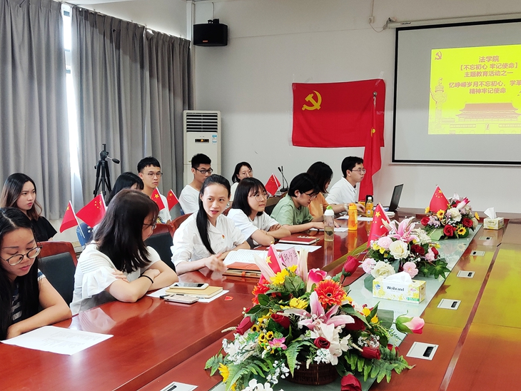 法学院开展了主题为“忆峥嵘岁月不忘初心,学革命精神牢记使命”的特色党日活动。活动以放映探访革命老兵视频、分享观影心得以及学生党员集体重温入党誓词的方式开展,增强了党员同志对革命精神的理解,提高党员的党性修养。