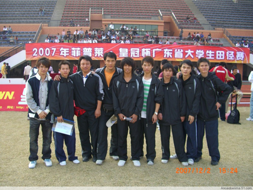 12月1日—12月2日,2007年“菲普莱•皇冠杯”广东省大学生田径赛在华南理工大学(大学城校区)举行。学院派出7名运动员,分别参加男子100米、男子400米、男子800米、男子1500米、男子5000米、跳远和三级跳远7个项目的角逐。