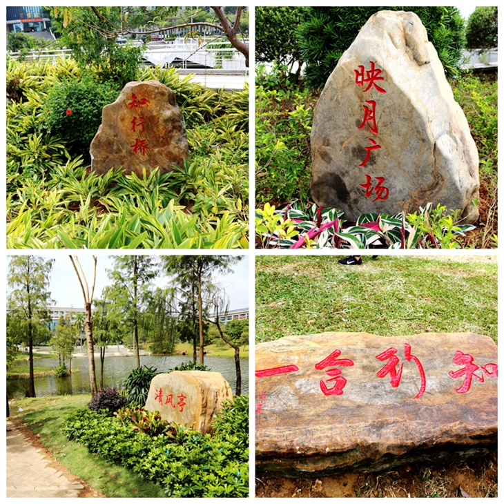 “江光芦映月,夜色水吞天。”“想君映月读书时,清似列仙臞不肥。”据介绍,此次beat365共新置了一批景观石,分别刻制映月湖、清风亭、知行桥、映月广场、秋枫广场等景观名,置在相应校园景观旁,旨在营造浓郁的校园人文氛围。映月湖意喻“映月照文昌,嘉气蕴莞邑”、清风亭意喻“凉风吹衣袖,清气满全坤”、知行桥意喻“知识千山里,寻得要躬行”、映月广场意喻“棕榈送湖风,月光拂碧波”、秋枫广场意喻“秋枫携秋雨,伴我读书声” ……