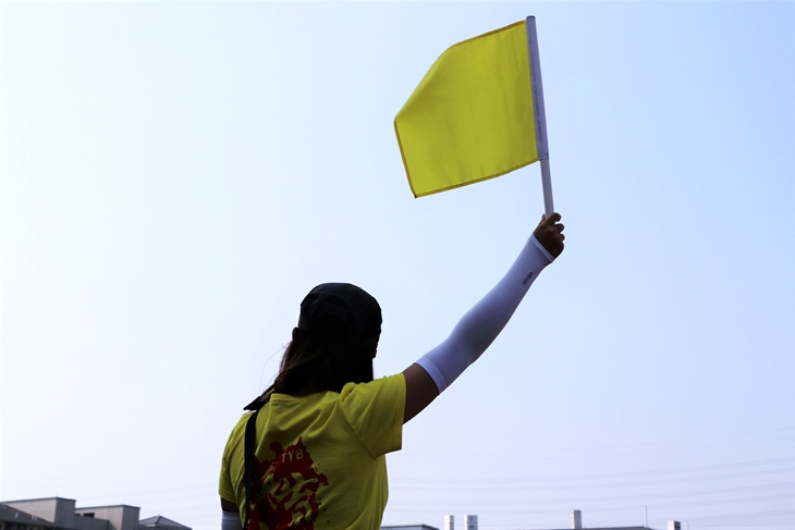 周四上午,在开幕式结束后,表演者们迅速退场,沿着足球场和跑道迅速搭建起了一圈防线。他们是来自不同学院的后勤工作人员,拉警戒线、登记记分牌都是他们工作内容的一部分。他们是经历一整天赛程的人,虽然不参与比赛,心却一直关注着,在观看之余还需留心现场秩序,统筹计分。
