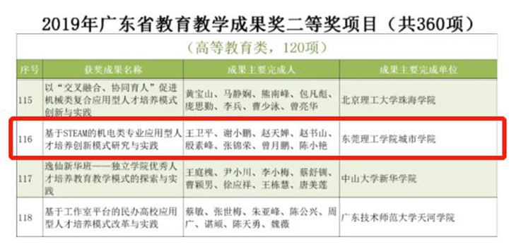 日前,广东省教育厅正式公布了2019年广东省教育教学成果奖获奖项目名单。beat365由王卫平校长主持的《基于STEAM的机电类专业应用型人才培养创新模式研究与实践》项目荣获高等教育类二等奖(项目成员有:谢小鹏、赵天婵、赵书山、殷素峰、张锦荣、曾月鹏、陈小艳)。