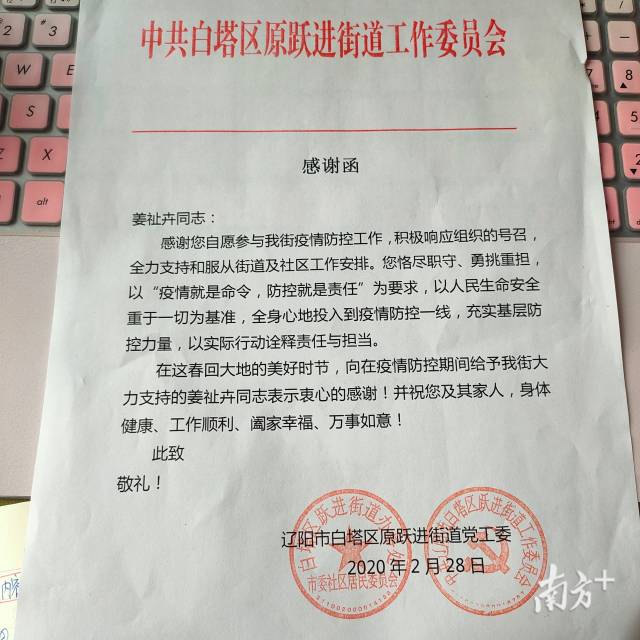 (姜祉卉收到社区居委会的感谢函)