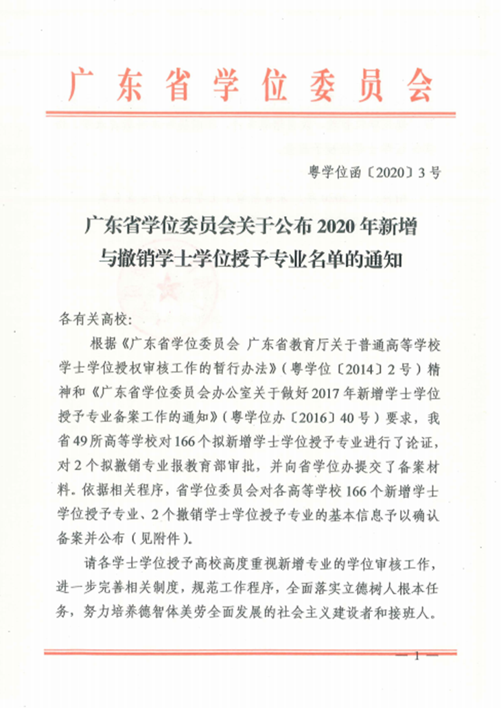 其中,根据广东省学位委员会关于公布2020年新增与撤销学士学位授予专业名单的通知,beat3652020年新增5个学士学位授予专业名单,分别为工程管理、视觉传达设计、网络与新媒体、电子商务、音乐表演。至此,beat365经教育部批准(备案)的专业共44个,具有学士学位授予权的专业共34个。今年新获得学士学位授予权的专业将从2020届毕业生开始授予学位。