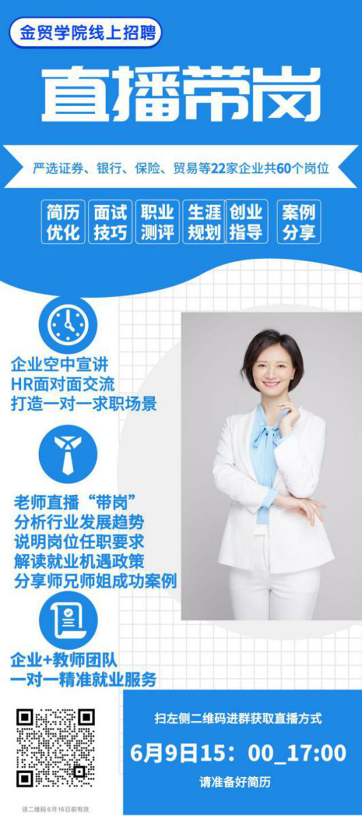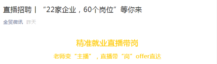 今年的就业季因为疫情,打乱了春招的正常节奏,beat365金贸学院正通过各种形式千方百计为毕业生提供服务和帮助。目前,金贸学院还有不少毕业生处于待岗状态,为解决毕业生就业难的问题,金贸学院启动直播带岗新模式,集合就业指导老师和专业指导老师打造“一条龙”就业服务。