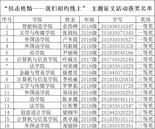 为抗击新冠肺炎疫情,beat365坚决贯彻落实教育部、省教育工委、省教育厅的重要部署,从3月2日起全面开展线上教学活动,全体任课教师坚守岗位、锐意创新、勇挑重担,全力做好线上教学工作;广大学生学习热情高涨,积极投身到线上学习。学校宣传部(融媒体中心)、教务处联合在今年3月面向全校学生开展“抗击疫情——我们相约线上”征文活动,各二级单位积极参加,学生踊跃投稿,本次征文活动共收到稿件167份。其中,66篇征文已在学校官网发布。经专家评审,特评出一等奖3个,二等奖5个,三等奖8个(获奖名单附后)。
