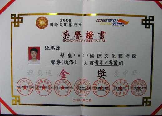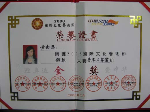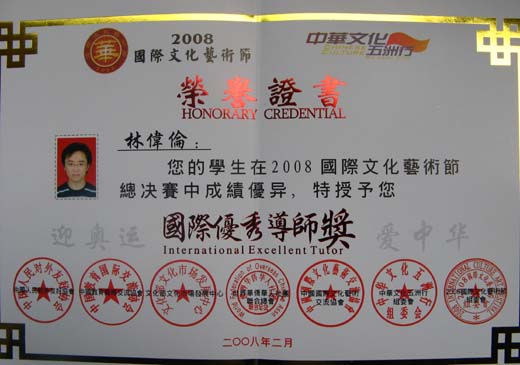 2008年2月11日—13日,2008国际文化艺术节全国总决赛在深圳举行。黄念恩同学荣获专业钢琴大赛青年A组金奖,张思源同学荣获专业声乐(通俗)大赛青年A组金奖,王佩玉同学荣获专业声乐(通俗)大赛青年A组银奖。他们的指导老师林伟伦获得国际优秀导师奖。