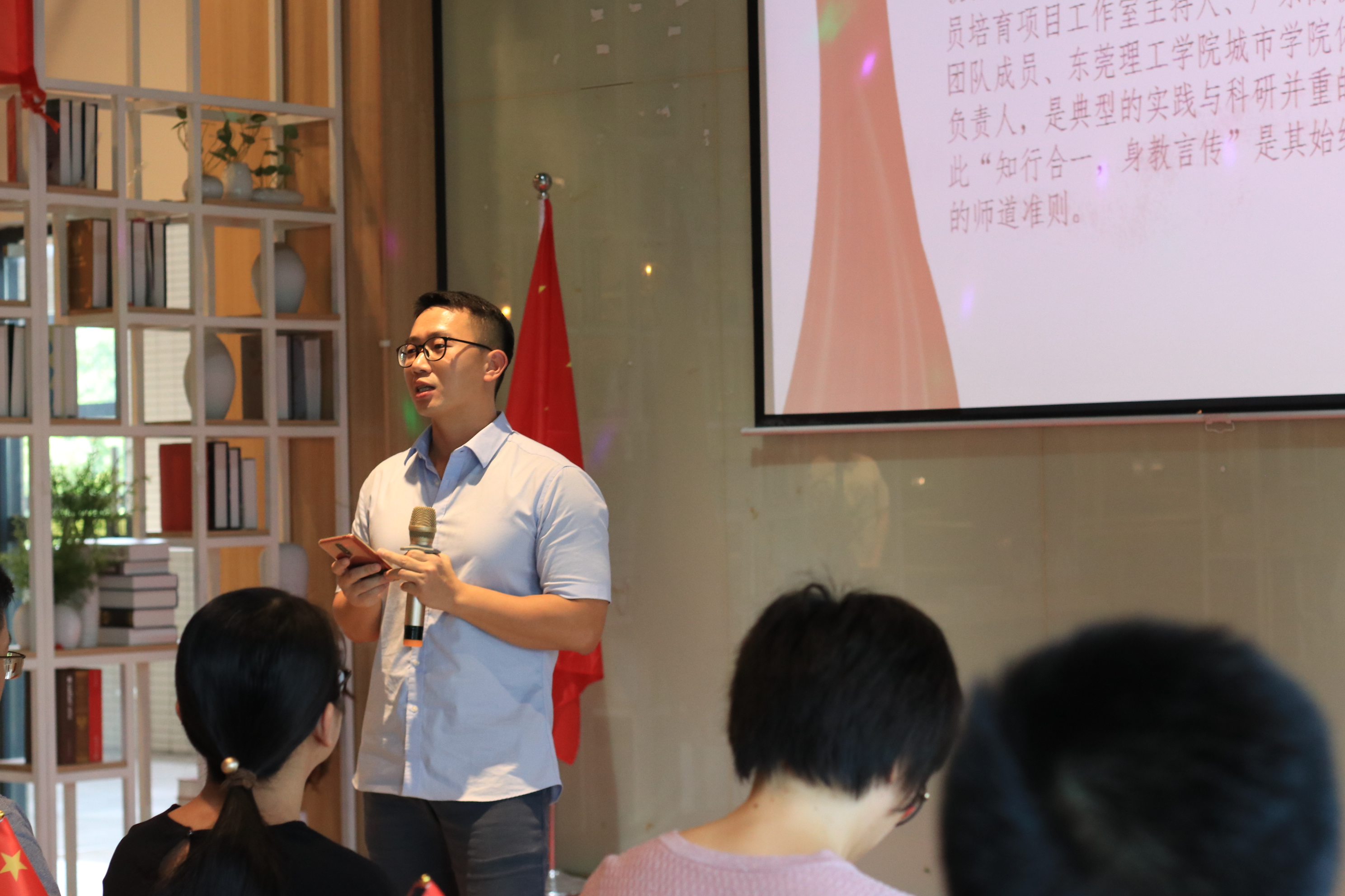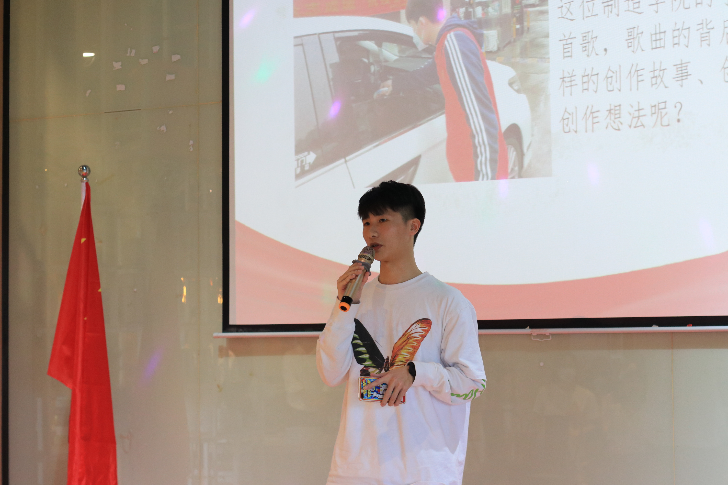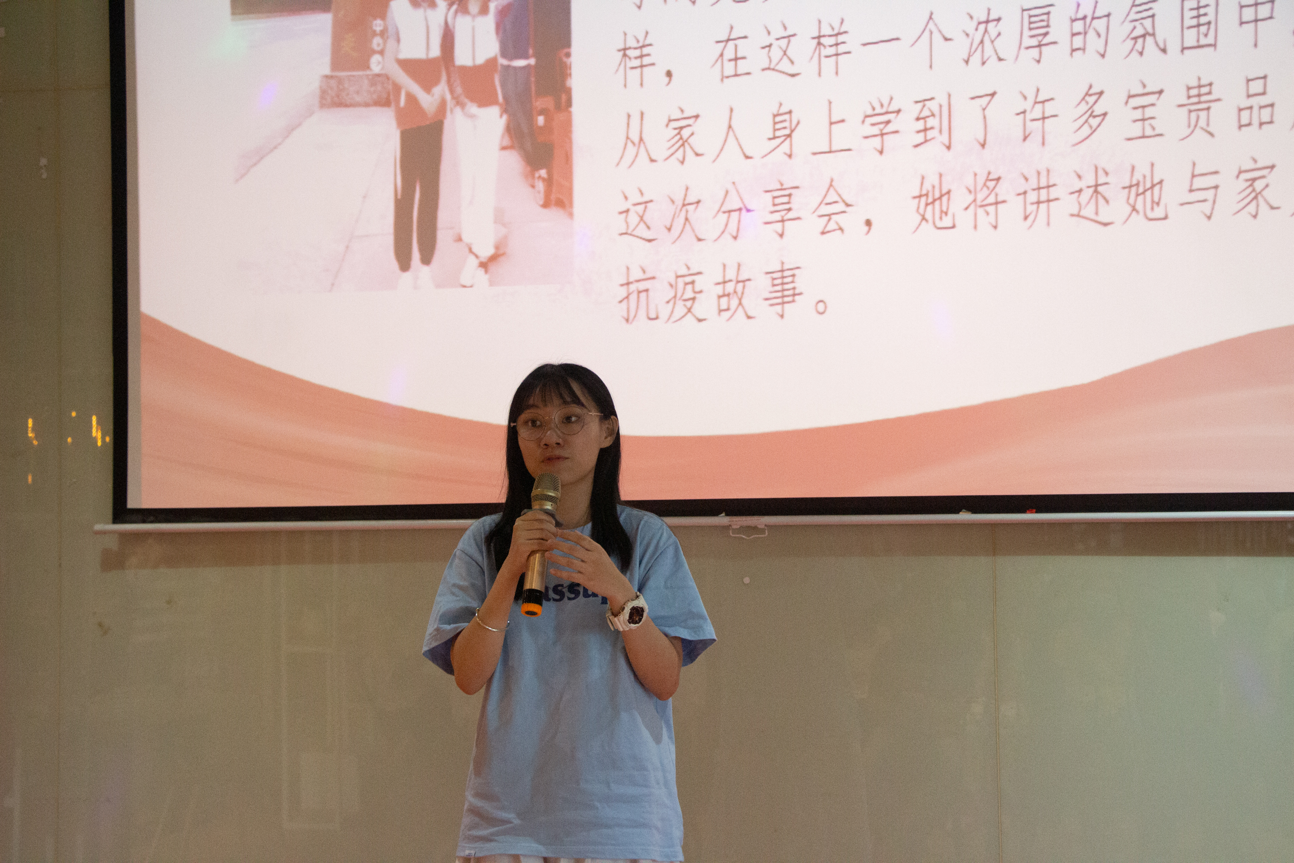 现场观众观看了抗疫主题视频《在一起》和诗歌朗诵《中国阻击战》。接下来陈浩华老师、占晶晶老师、智能制造学院李宗达同学、城建与环境学院詹海燕同学以及文学与传媒学院王媛同学分享了在志愿活动中的所见所闻,以及内心最真实的感触。