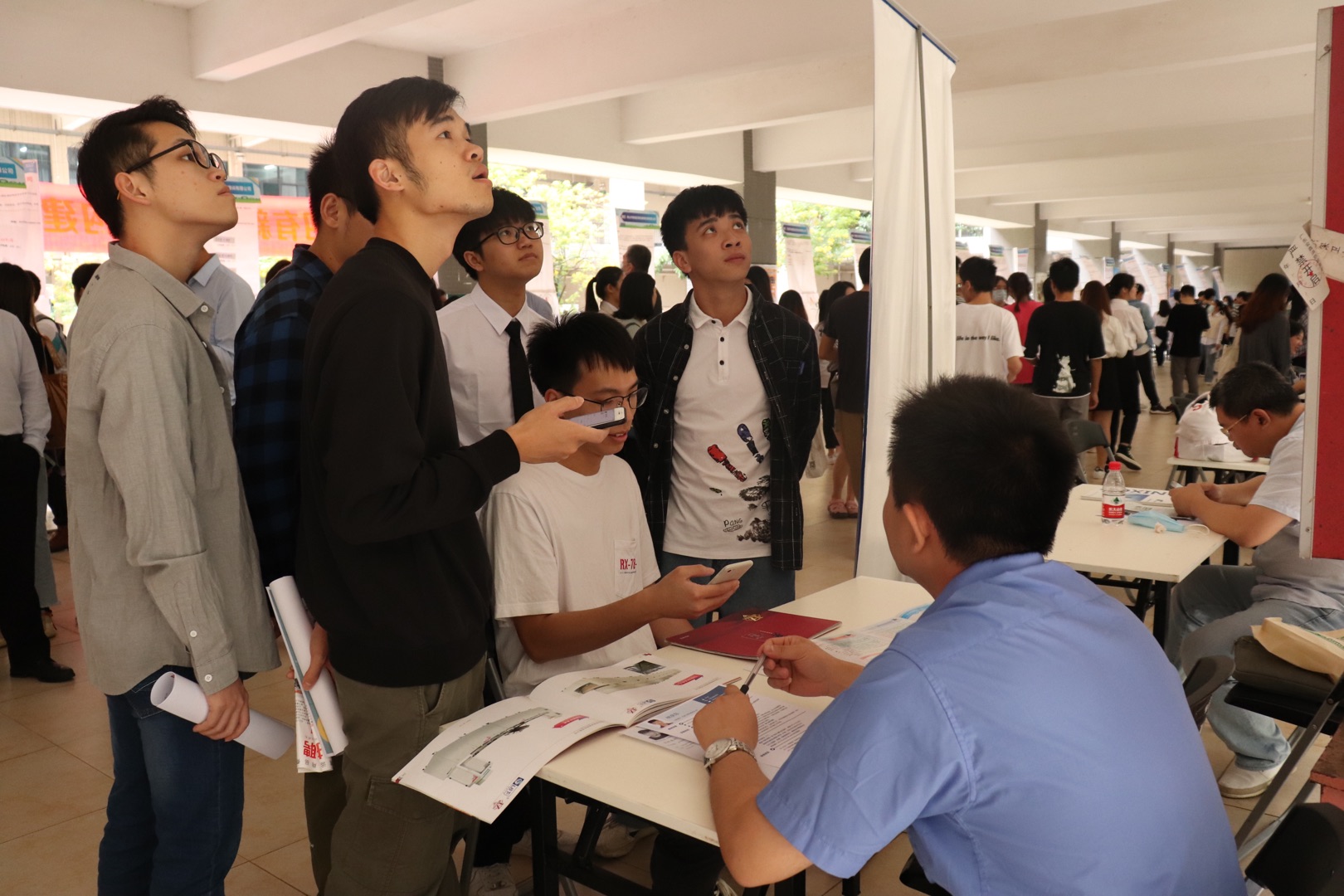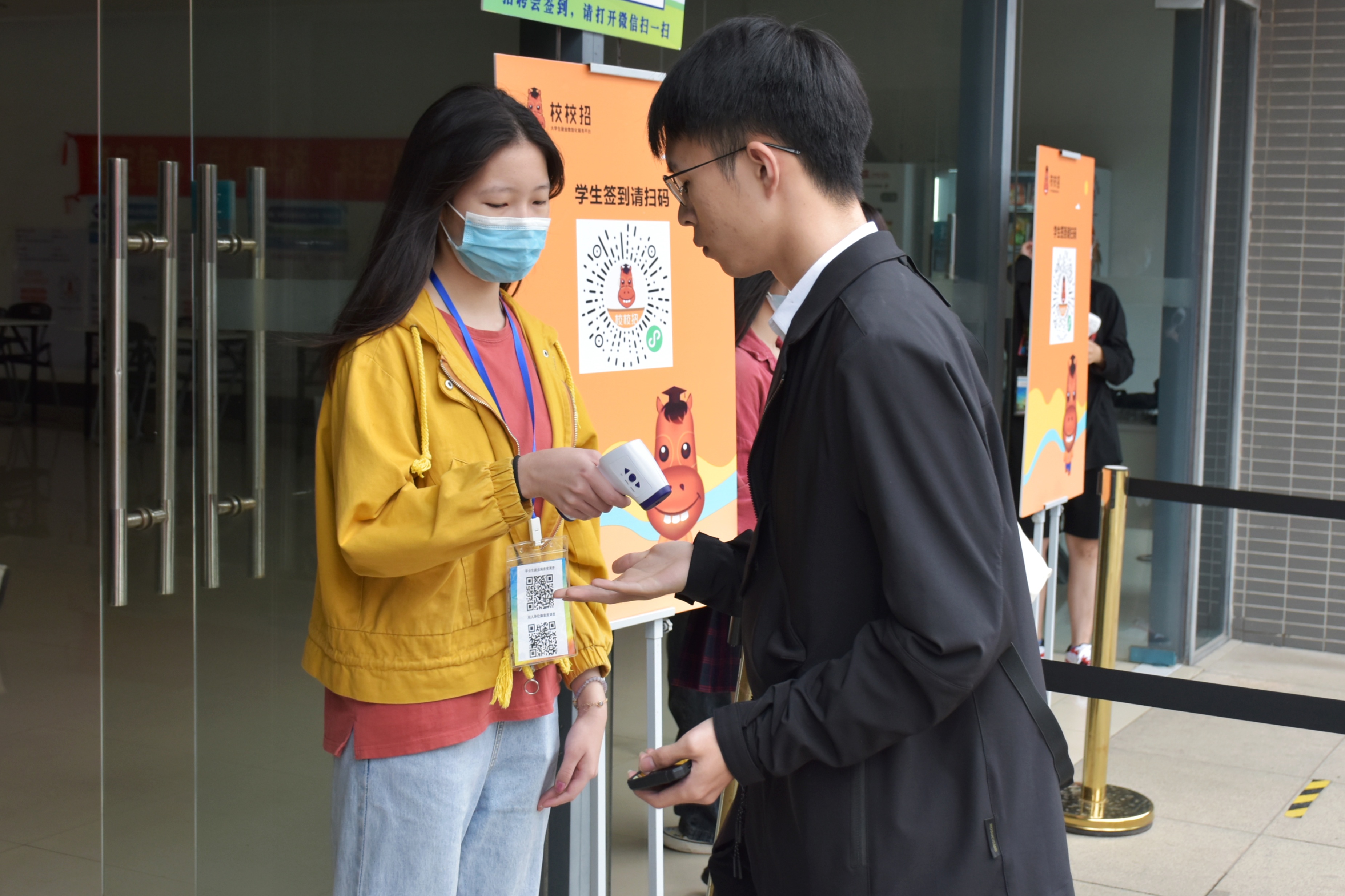 受疫情影响,beat365加强了疫情防控工作,所有现场人员需通过粤康码、行程卡、学校开具的通行证以及体温不超过37.3℃的疫情防控标准方可入场,且需佩戴口罩。进出等候及参会期间均保持1.5米以上距离。虽然口罩隔离了人的身体距离,现场招聘和应聘的热情却没有退怯。