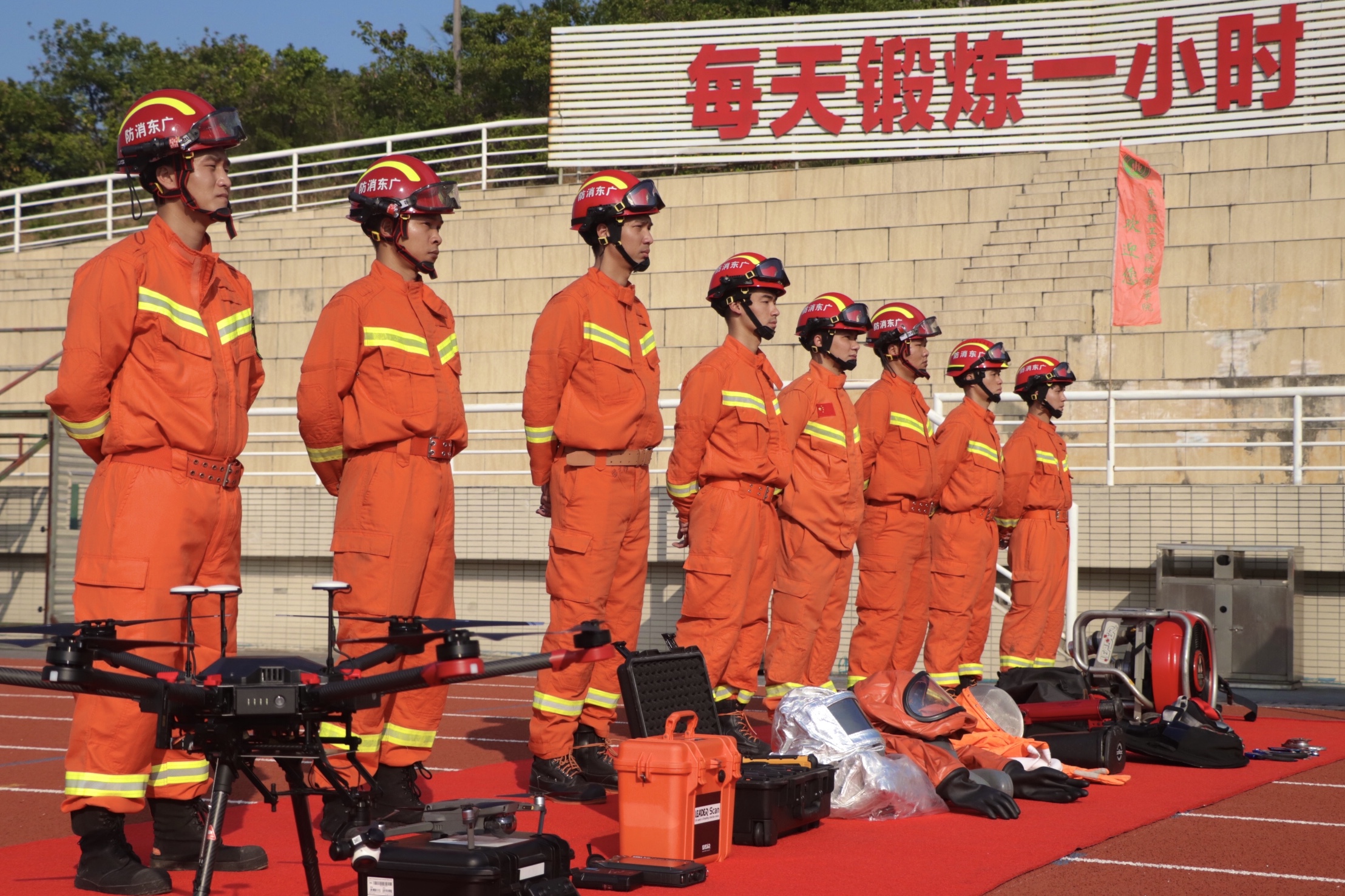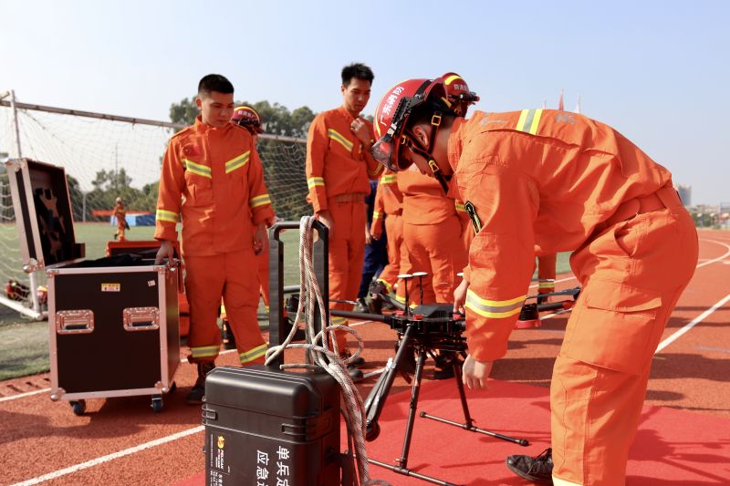 在场人员一同观看消防救援站汇报表演和消防器材技能展示。寮步镇消防大队队员代表为同学们展示了各种不同的消防灭火方法,也展示了多种多样的消防工具。